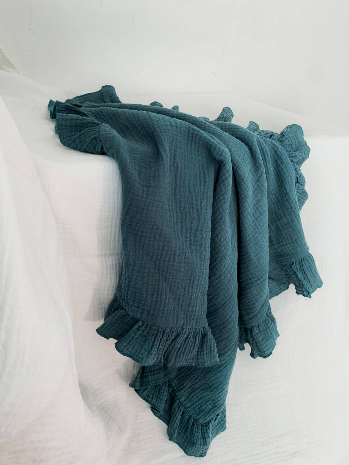 Unsere Wickeldecke aus 100 % Baumwollmusselin hat eine herrlich knittrige Textur – der Inbegriff von Weichheit, Atmungsaktivität und Flauschigkeit. Der bezaubernde Rüschenrand verleiht eine süße und wunderschöne Note und macht sie zum ultimativen Wickeltuch für Neugeborene und Kleinkinder. Schenken Sie Ihrem Kleinen den Luxus von Komfort in einer bezaubernden Umarmung.